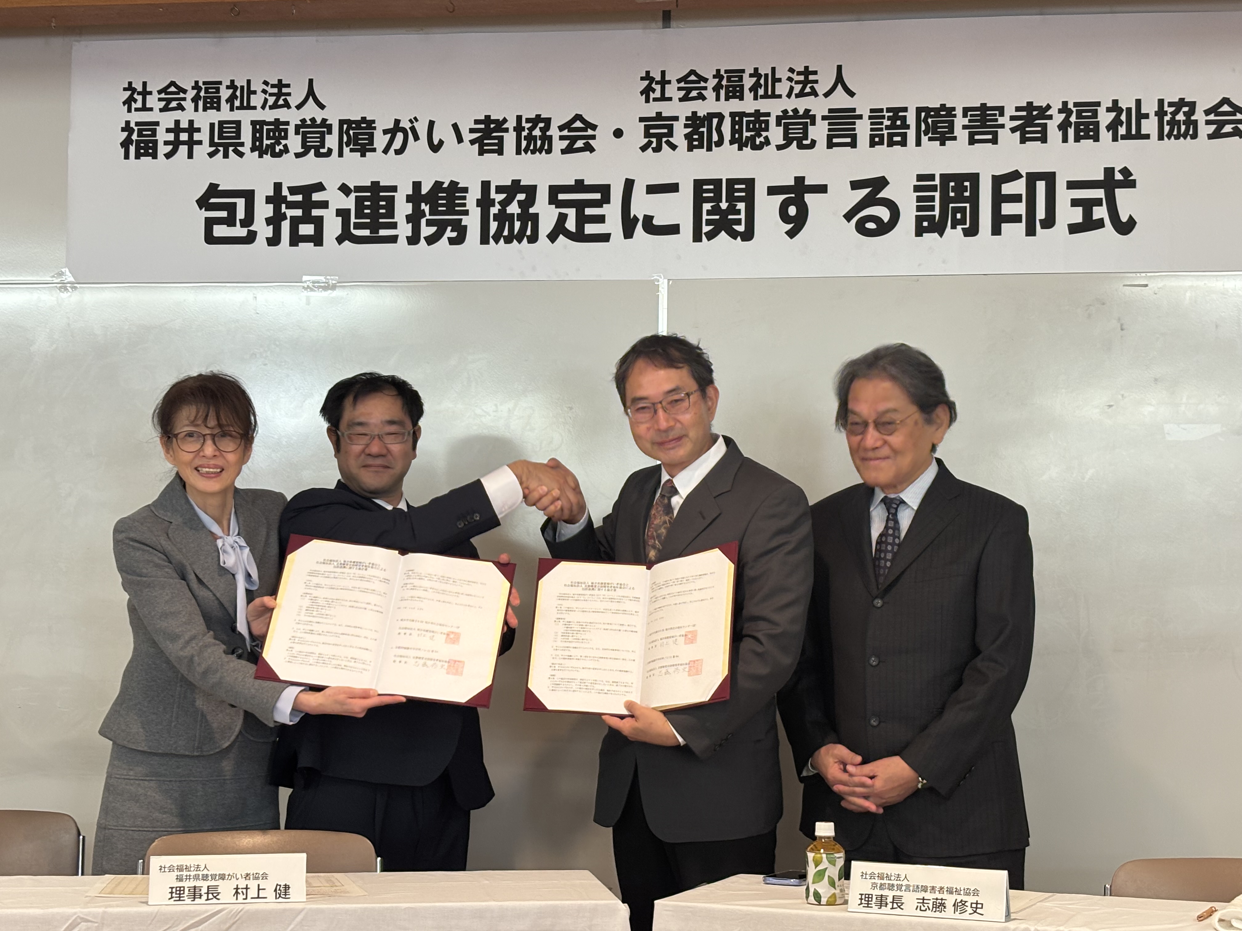 全国に先駆けた 聴覚障害福祉の持続可能な発展のモデルケースへ! 2025年10月29日(水)、敦賀市福祉総合センターあいあいプラザにて、 社会福祉法人福井県聴覚障がい者協会と社会福祉法人京都聴覚言語障害者福祉協会の 包括連携協定に関する調印式を執り行いました。